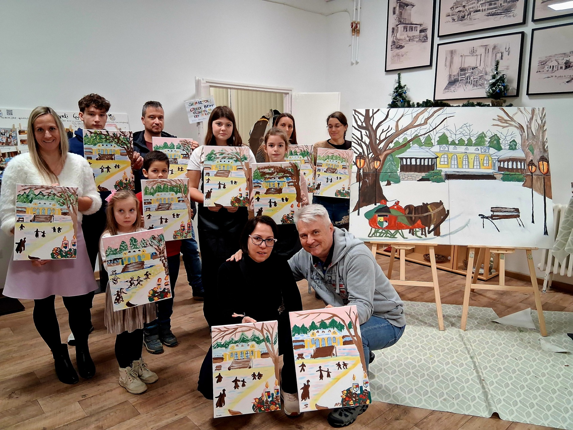 vászon – 50×40 cm vagy 60x80 cm, ecsetek, festék, állvány, festőkötény (stúdiónkban és kiszállásnál is)